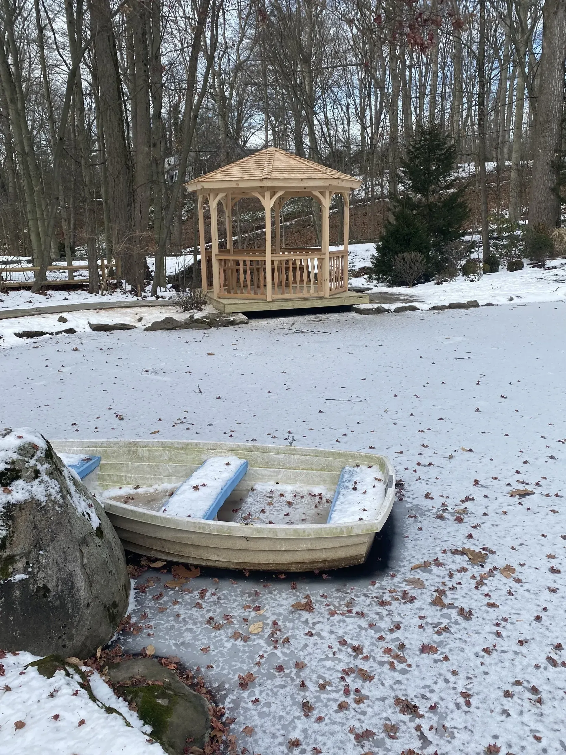 The gazebo located on the edge of the pond spans the spillway over the outlet stream. The only way to the other side when you can't use a boat. #sheds #shedbuilders #babybarns #arbors #trellises #gazebos #pavillions #shedsrockland #shedsbergen #shedswestchester #shedsorange