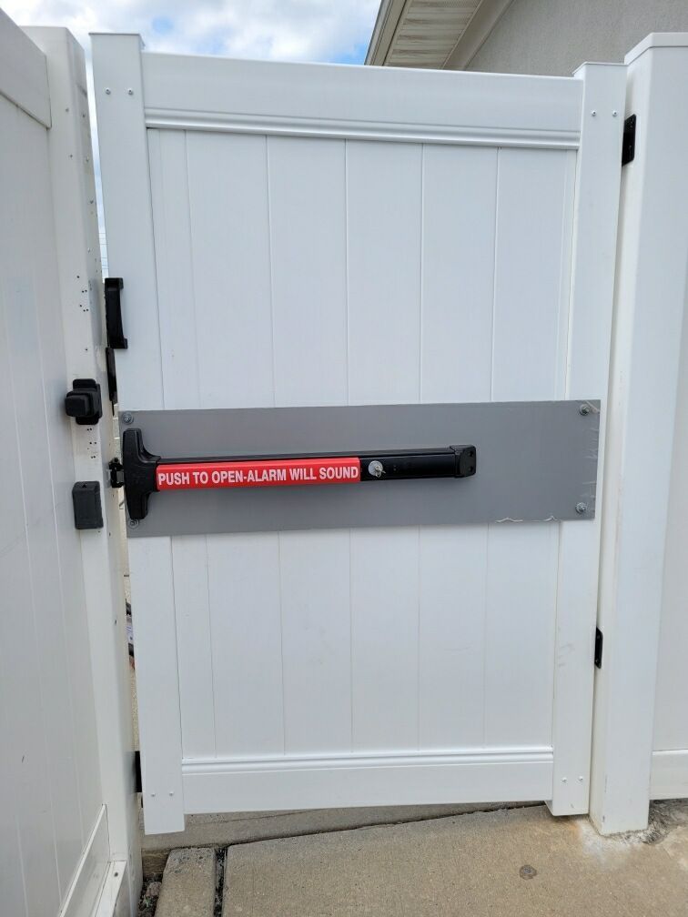 We can add a panic bar to any security gate, including active yards dogwood vinyl. #activeyardsfence
